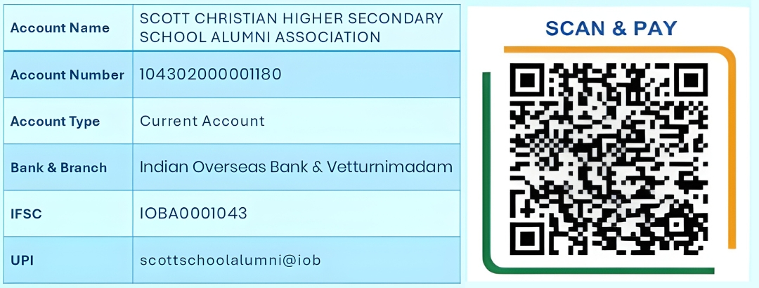 Scott Christian Higher Secondary School Alumni Association, Nagercoil appeals to its proud alumni and well-wishers to join hands in shaping the future of our students. Your generous donation will help support the tuition fees of deserving students, hostel fees of students with economically challenging backgrounds, to provide free and quality JEE and NEET coaching for the aspirants, strengthening school infrastructure, and enhance sports facilities. These initiatives aim to create equal opportunities, nurture talent, and promote holistic development. Every contribution, big or small, will make a meaningful difference in empowering young minds and preserving the legacy of excellence of our alma mater. Together, let us invest in education, character, and a brighter tomorrow.