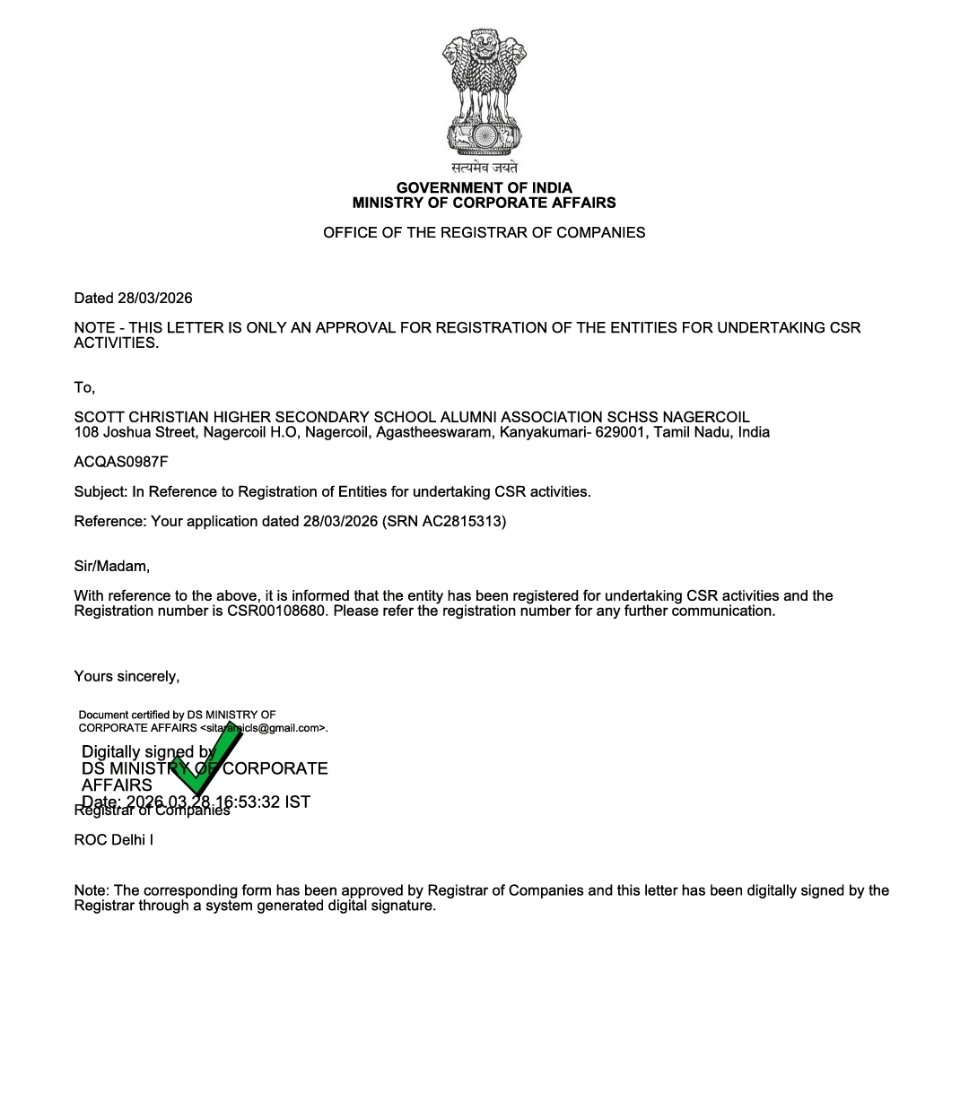 IOB Bank Details SBI Bank Details PAN Details Association Registration Certificate Under T'N Society Registration Act 1976 Office of the Registrar of Companies Form 10C - 80G and 12A Order for provisional registration Order for provisional approval DARPAN Certificate Scott School Alumni Association DARPAN Certificate